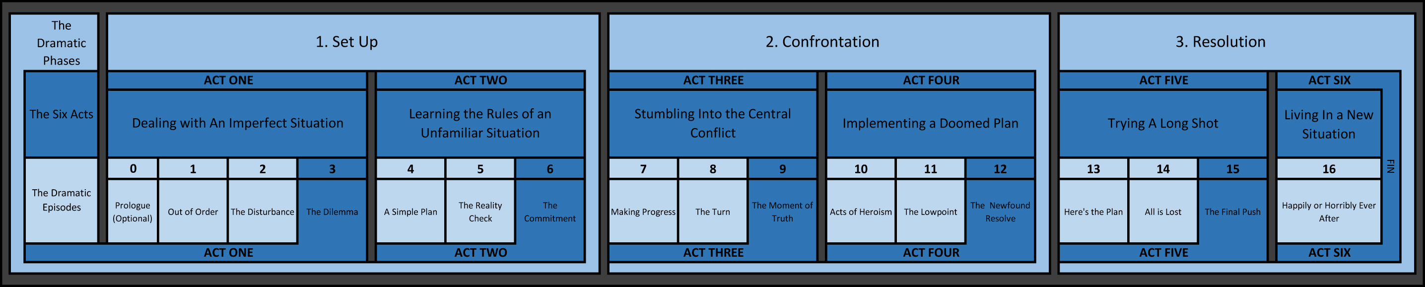 The new Story Structure video breakdown for Wreck-it-Ralph should be posted this weekend. While I’m making the finishing touches, I decided to whip up the below blueprint of Six Act Structure for those who enjoy visuals. As you can see, there are two Acts contained in each of the three traditional Dramatic Phases. With the exception of Act Six (and Act One if there’s a prologue), each Act contains three Dramatic Episodes, the last of which being the Act Turning Point.